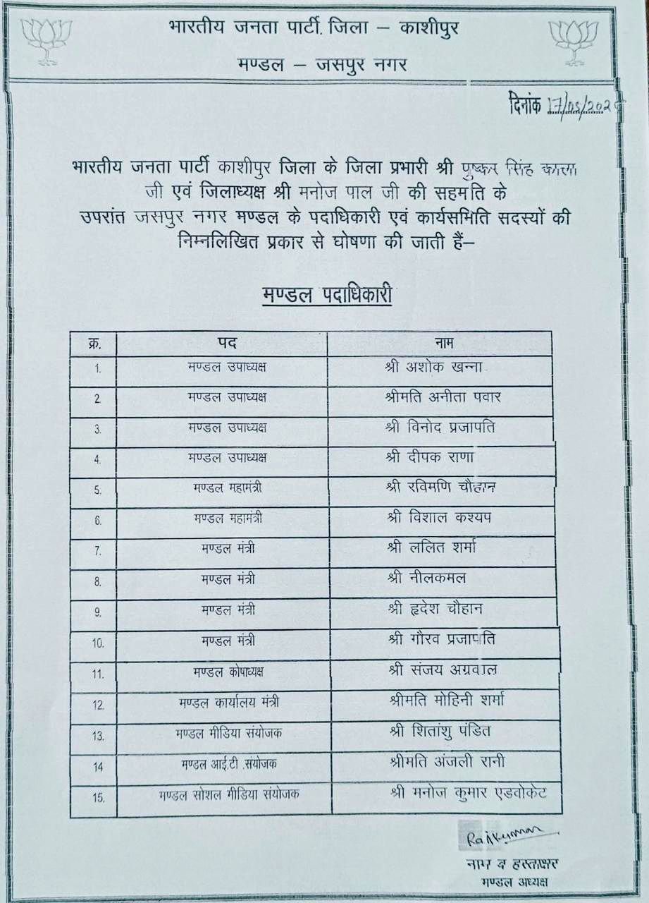 उत्तराखण्ड: भारतीय जनता पार्टी के काशीपुर जिला प्रभारी पुष्कर सिंह व काशीपुर जिला अध्यक्ष मनोज पाल की सहमति पर भाजपा के नवनिर्वाचित जसपुर नगर अध्यक्ष राजकुमार चौहान ने भारतीय जनता पार्टी की जसपुर नगर कार्यकारिणी घोषित कर दी ।