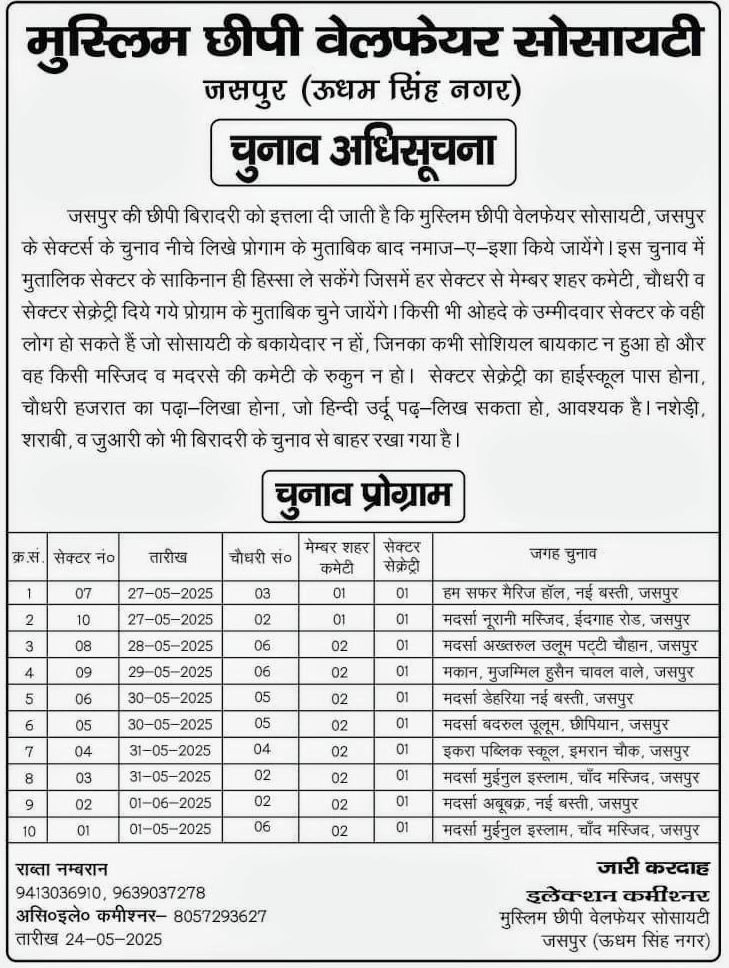 उत्तराखण्ड: जनपद उधम सिंह नगर के प्रमुख नगर जसपुर में मुस्लिम छीपी वेलफेयर सोसाइटी के लिए सदर का चुनाव 18 म ई 2025 को किया जा चुका है । इस सोसायटी के लिए अब नगर जसपुर में 10 चौधरी का चुनाव किया जाना बाकी है ।
