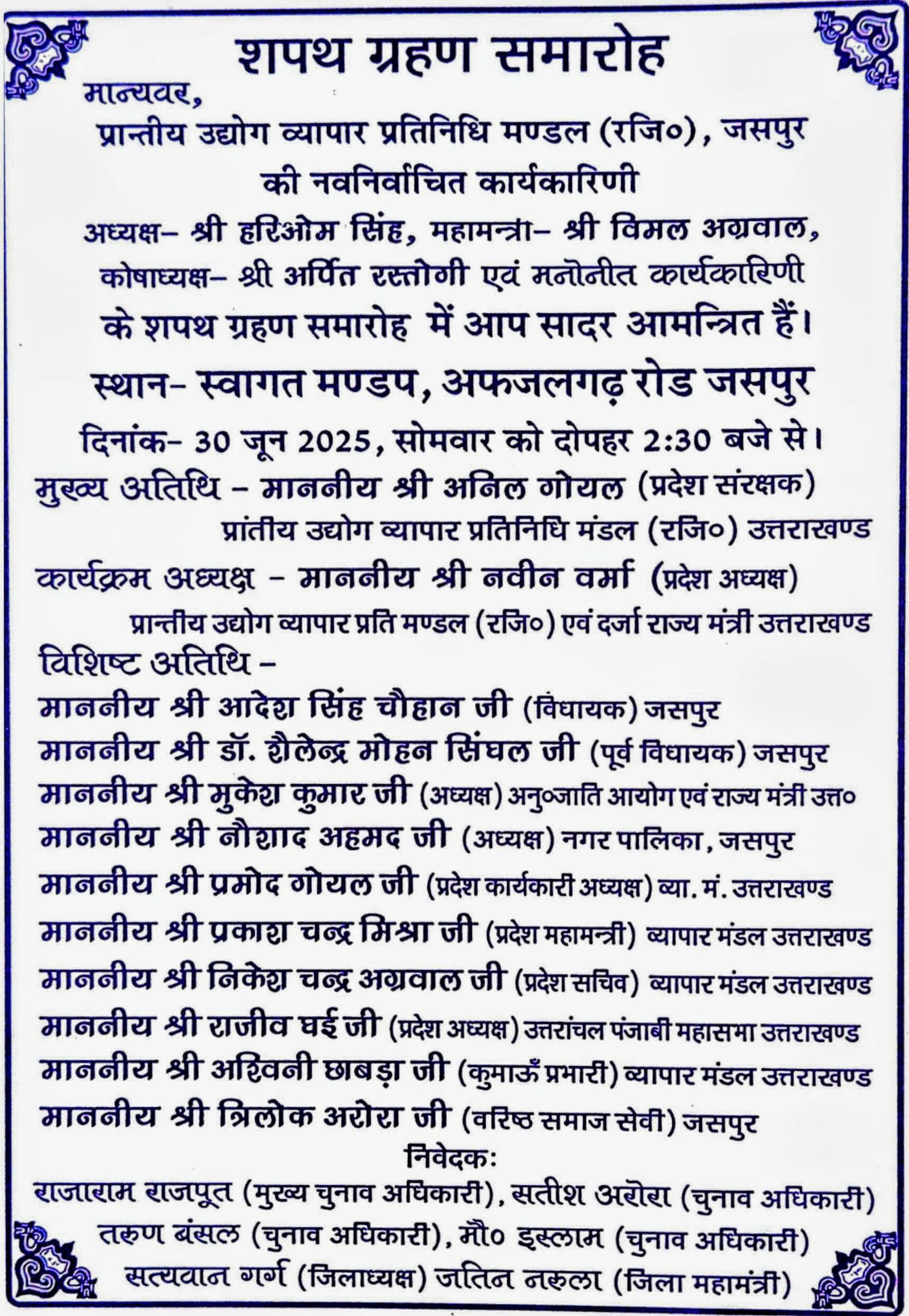 उत्तराखण्ड: प्रांतीय उद्योग व्यापार प्रतिनिधि मंडल जसपुर के नव निर्वाचित पदाधिकारियों का शपथ ग्रहण समरोह 30 जून 2025 सोमवार को अपराह्न 2:30 बजे अफजलगढ़ रोड,जसपुर स्थित स्वागत मंडप में आयोजित किया जाएगा ।