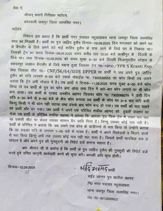 उत्तराखण्ड: जनपद ऊधम सिंह नगर जसपुर क्षेत्र की नगर पंचायत महुआ डाबरा का 20 वर्षीय युवक जाहिद हुसैन पुत्र सईद अहमद अपने बड़े भाई शाहिद हुसैन के पास बेंगलुरु जा रहा था । जिसके दौरान लापता हो गया । लापता हुए इस युवक का 10 वें दिन कहीं कोई पता नहीं चल पाया। जिससे उसके परिजन व सगे संबंधी अत्यधिक चितित हैं । परिजनों ने बताया कि जाहिद विगत 10 सितंबर को घर से रवाना हुआ था । उन्होंने घटना के संबंध में जसपुर कोतवाली में तहरीर दी है ।