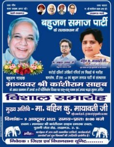 उत्तराखण्ड : पूर्व मुख्यमंत्री,उत्तर प्रदेश 9 अक्टूबर 2025 को बहन कुमारी मायावती बहुजन समाज पार्टी के संस्थापक कांशीराम जी के परिनिर्वाण दिवस पर कांशीराम स्मृति पार्क, लखनऊ में देश हित में एक विशाल सभा को सम्बोधित करेंगी ।
