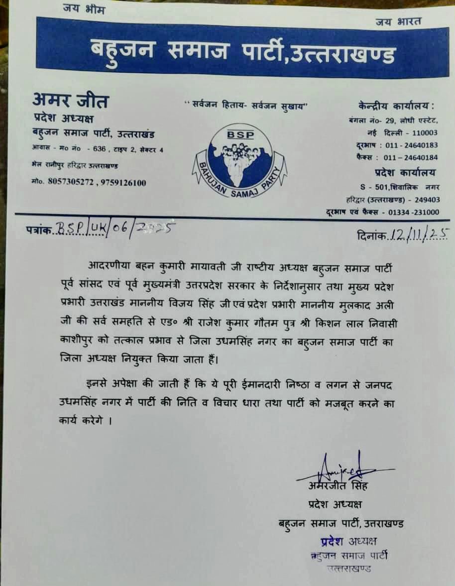 को ऊधम सिंह नगर का पुनः बसपा जिला अध्यक्ष बनाया गया ।