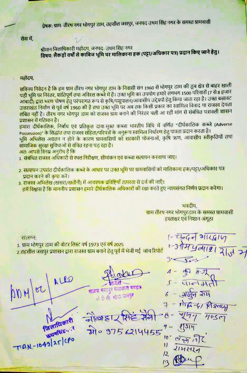 देकर कहा है कि वे (1500 परिवार 7-8 हजार आबादी) सन 1960 से भोगपुर डाम के डूब क्षेत्र से बाहर खाली पड़ी भूमि पर रह रहे हैं । उक्त भूमि पर उनके घर बने हुए हैं तथा सभी प्रकार के राजस्व, बिजली-पानी के बिल नियमित रूप से जमा कर रहे हैं । इसके बावजूद अब तक उन्हें उक्त भूमि पर मालिकाना हक प्राप्त नहीं हुआ है । उन्होंने कहा है कि उक्त भूमि पर लंबे समय से उनके शांतिपूर्ण, निर्विवाद एवं निरंतर कब्जे हैं । इसके बावजूद उक्त भूमि पर उन्हें पट्टे/मालिकाना अधिकार नहीं दिया जा रहा है । जिससे उन्हें आवास योजनाओं, ऋण सुविधाओं तथा सरकारी लाभों से वंचित होना पड़ रहा है। उन्होंने मांग की है कि संबंधित राजस्व अधिकारी हैं स्थलीय निरीक्षण ,सीमांकन एवं कब्जा सत्यापन करा कर दीर्घकालिक कब्जे के आधार पर उन्हें उक्त जमीन पर मालिकाना हक दिया जाए । मांग करने वालों में चंदन भारद्वाज, नवबहार सिंह सैनी, ओमप्रकाश राजभर, अर्जुन राय, राजू राय, गोविंद विश्वास आदि ग्रामीण शामिल हैं।