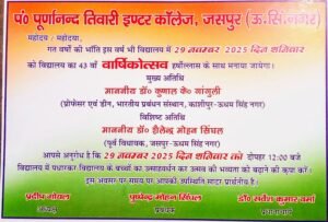 उत्तराखण्ड: जनपद ऊधम सिंह नगर के प्रमुख नगर जसपुर के राष्ट्रीय स्तर पर ख्याति प्राप्त इंटर कॉलेज पंडित पूर्णानंद तिवारी इंटर कॉलेज का 43 वां वार्षिकोत्सव 29 नवंबर 2025 को धूमधाम से मनाया जाएगा ।