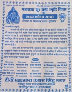 उत्तराखण्ड: सैनी महासभा ऊधम सिंह द्वारा 25 दिसंबर 2025 को काशीपुर में महाराजा शूर सैनी स्मृति दिवस धूमधाम से मनाया जाएगा । इस अवसर पर भव्य शोभायात्रा निकाली जाएगी । शोभा यात्रा का शुभारंभ प्रातः 10:00 बजे काशीपुर किला बाजार से किया जायेगा । शोभा यात्रा काशीपुर मेन बाजार, महाराणा प्रताप चौक (छततरी चौराहा), नई सब्जी मंडी होते हुए मोहल्ला लक्ष्मीपुर पट्टी,काशीपुर स्थित सैनी महासभा भवन पर संपन्न होगी ।