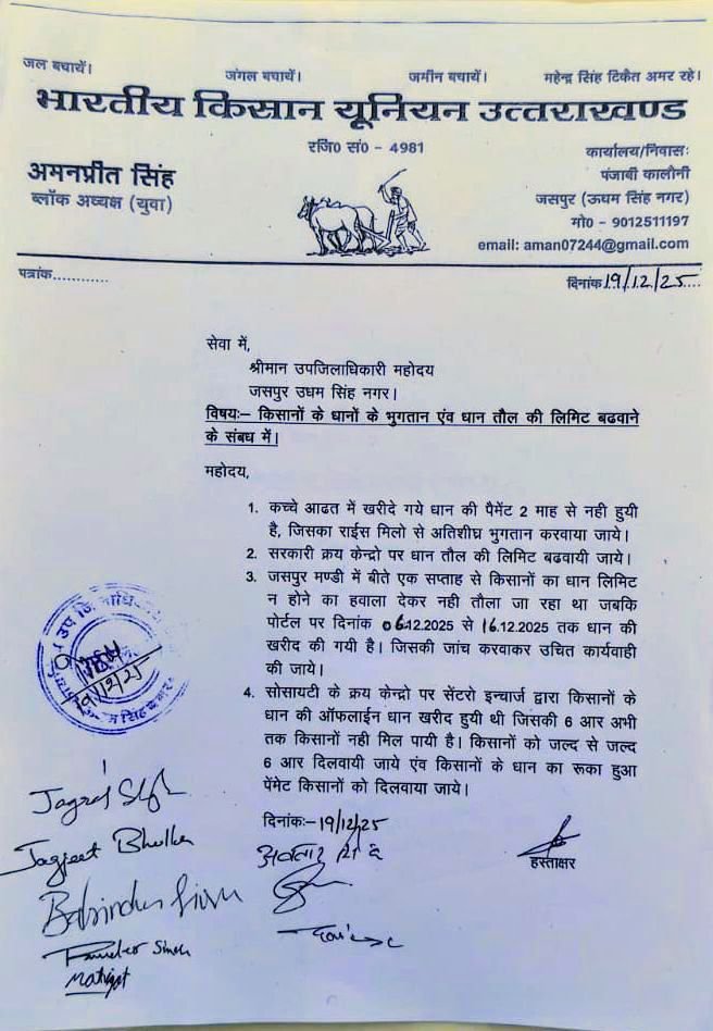 उत्तराखण्ड: भारतीय किसान यूनियन के कार्यकर्ताओं ने जसपुर क्षेत्र की धान खरीद संबंधी समस्याओं को लेकर एसडीएम कार्यालय के सामने सांकेतिक धरना दिया और एसडीएम के आश्वासन पर उन्होंने अपना धरना समाप्त कर दिया।