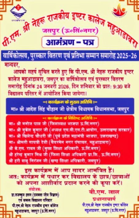 उत्तराखण्ड: जनपद ऊधम सिंह नगर के प्रमुख क्षेत्र जसपुर के पी एम श्री नेहरू राजकीय इंटर कॉलेज महुआ डाबरा का वार्षिकोत्सव, पुरस्कार वितरण एवं प्रतिभा सम्मान समारोह