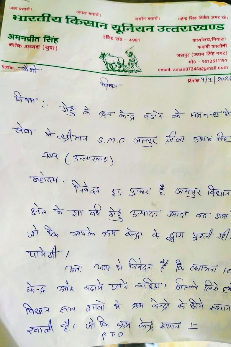 जसपुर विधान सभा क्षेत्र में मात्र 5 गेहूं क्रय केंद्र स्थापित किए गए हैं । ये पांचों गेहूं खरीद केंद्र जसपुर कृषि उत्पादन मंडी समिति परिसर में ही लगाए गए हैं गए हैं । इसके अलावा एक गेहूं खरीद केंद्र गढ़ी नेगी के नाम काशीपुर मंडी में स्थापित किये जाने की जानकारी मिली है । भारतीय किसान यूनियन के कार्यकर्ताओं ने 4 अप्रैल 2026 को एस एम ओ को ज्ञापन देकर स्थापित किए गए गेहूं खरीद केंद्रों की संख्या को काम बताया गया । कहा गया कि इस बार गेहूं की पैदावार अधिक है। उसे देखते हुए जो क्या केंद्र लगाए गए हैं उनके संख्या गेहूं की पैदावार के हिसाब से कम है । ज्ञापन में जसपुर विधानसभा क्षेत्र में ग्रामीण क्षेत्र के 10 गेहूं खरीद केंद्र और स्थापित करने की मांग की गई है ।