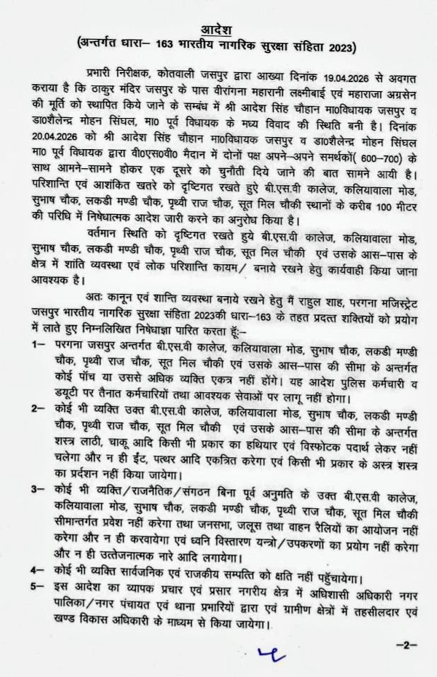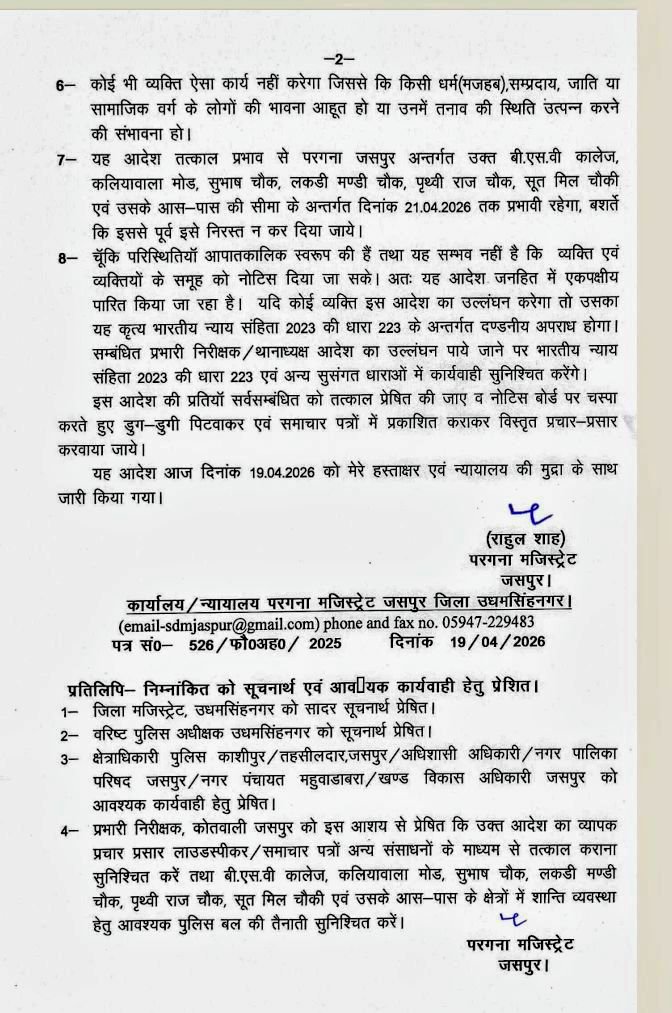 जसपुर बीएसवी इंटर कॉलेज, कलिया वाला मोड़, सुभाष चौक लकड़ी मंडी चौक, पृथ्वीराज चौहान चौक व सूत मिल पुलिस चौकी स्थानों को संवेदनशील क्षेत्र मानकर निषेधाज्ञा लागू कर दी गई थी और 20 अप्रैल 2026 को प्रशासन व पुलिस प्रशासन सुबह से ही पूरी तरह अलर्ट है । माहौल खराब होने तथा शांति एवं कानून व्यवस्था भंग होने की आशंका से शांति एवं कानून व्यवस्था बनाए रखने के लिए प्रशासन द्वारा एहतियात के तौर पर 1 प्लाटून पुरुष पीएसी व 1 प्लाटून महिला पीएसी तथा जनपद उधम सिंह नगर के अन्य थानों से भी पर्याप्त फोर्स मंगायी गयी है । पुलिस लगातार स्थिति पर नजर रखे हुए है। संवेदनशील घोषित स्थानों पर लगातार राउंड ले रही है । समझा जा रहा है कि प्रशासन व पुलिस प्रशासन की इतनी बड़ी सतर्कता के चलते बीएसवी इंटर कॉलेज में व संवेदनशील घोषित स्थान पर परिंदा भी पर नहीं मार सकेगा और शांति एवं कानून व्यवस्था पूर्णतः कायम रहेगी ।